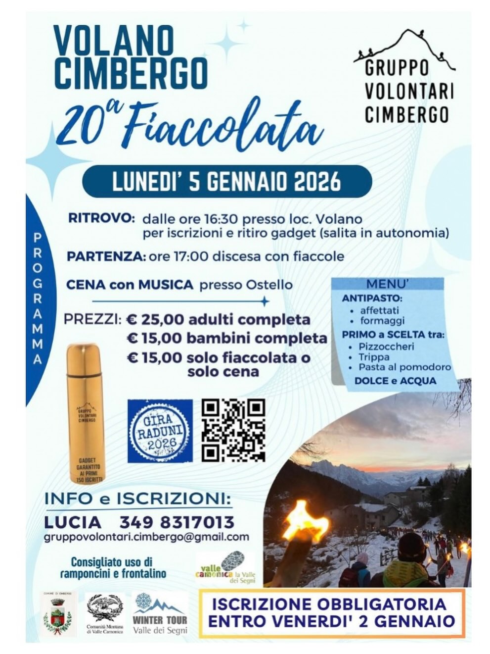 La Fiaccolata Volano-Cimbergo è una suggestiva camminata invernale notturna che si tiene ogni Epifania in Valle Camonica, con partenza dalla località Volano e arrivo a Cimbergo illuminata dalle fiaccole distribuite ai partecipanti.