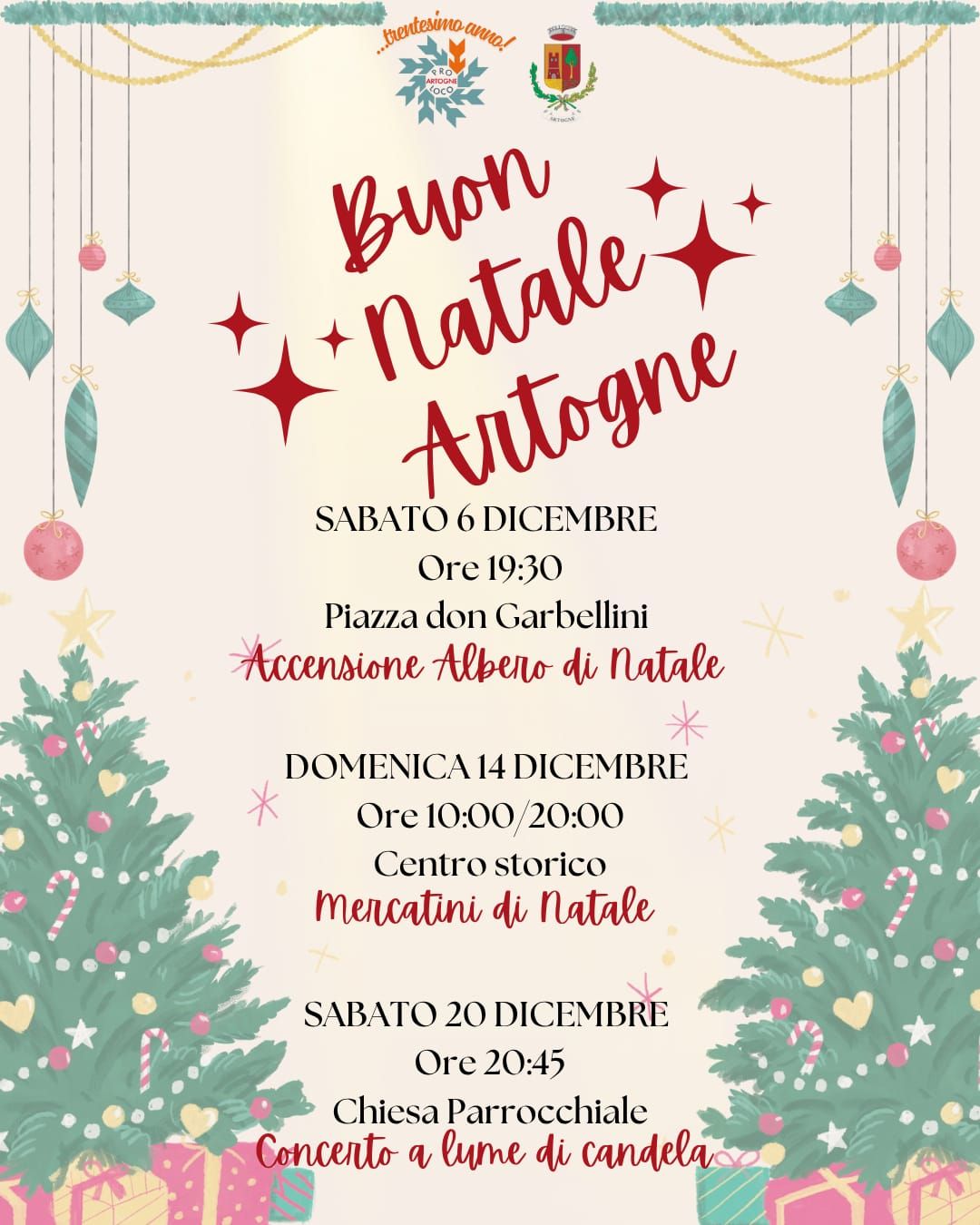 Il programma degli eventi natalizi di Artogne parte il 6 dicembre con l’accensione dell’albero di Natale per poi proseguire con i mercatini di Natale il 14 dicembre e concludere il 20 con un concerto a lume di candela all’interno della Chiesa Parrocchiale.