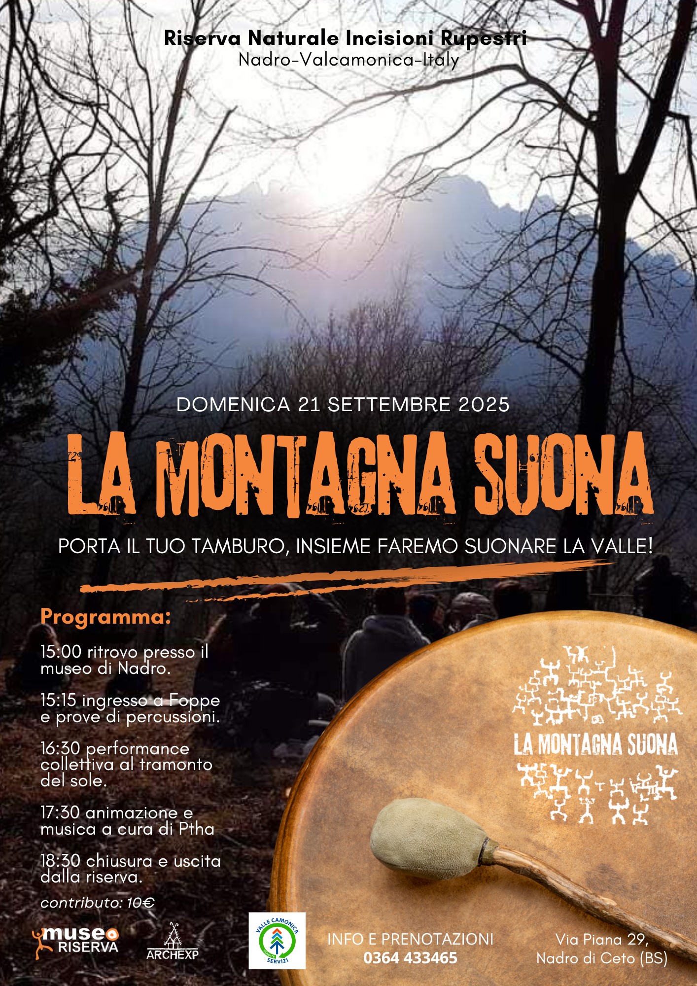 La Montagna Suona è un evento musicale immerso nella natura, in programma domenica 21 settembre 2025 presso la Riserva Naturale delle Incisioni Rupestri di Nadro (Valcamonica). Partecipanti e visitatori sono invitati a portare il proprio tamburo per un coinvolgente momento collettivo: ritrovo al Museo di Nadro, prove di percussioni nella suggestiva area di Foppe, un’esibizione collettiva al tramonto, seguita da animazione e musica a cura di Ptha. La giornata si conclude con la chiusura della riserva.