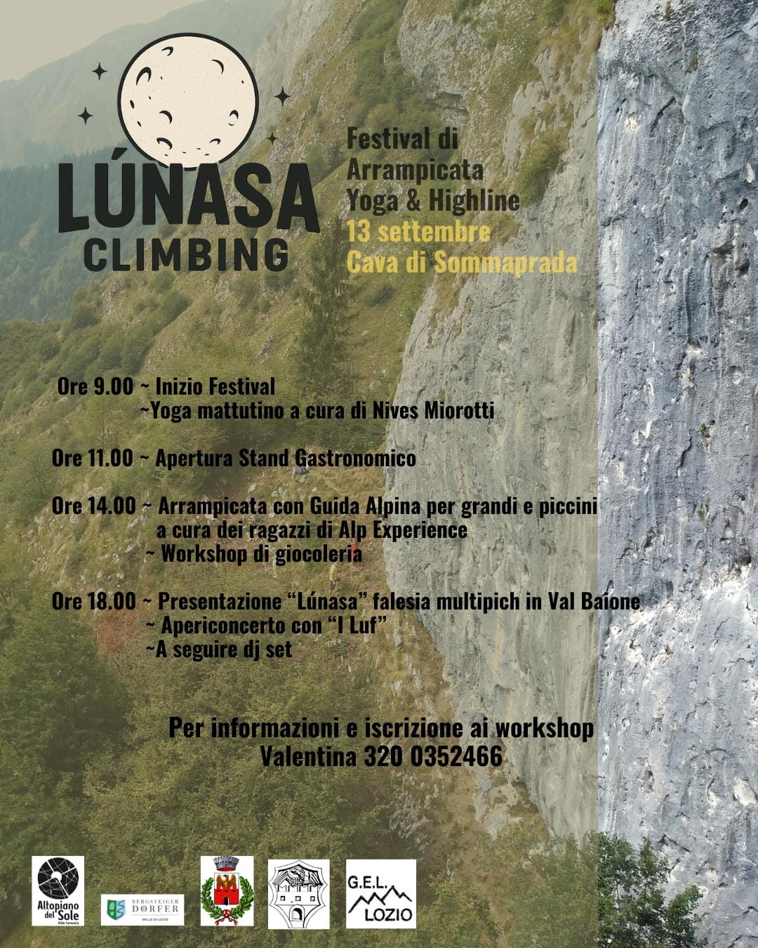 Una giornata immersa nella natura a Cava di Sommaprada il 13 settembre, tra falesie e panorami sorprendenti. Si parte al mattino alle 9:00 con una sessione di yoga mattutino guidata da Nives Mirotti. Alle 11:00 aprono gli stand gastronomici. Dopo pranzo, dalle 14:00, ci si mette alla prova con un’arrampicata guidata per adulti e bambini, accompagnata da un workshop di giocoleria. Alle 18:00 si presenta la nuova falesia multipitch “Lúnasa” in Val Baione, seguita da un apericoncerto con il gruppo “I Luf” e un dj set per concludere la serata in musica.