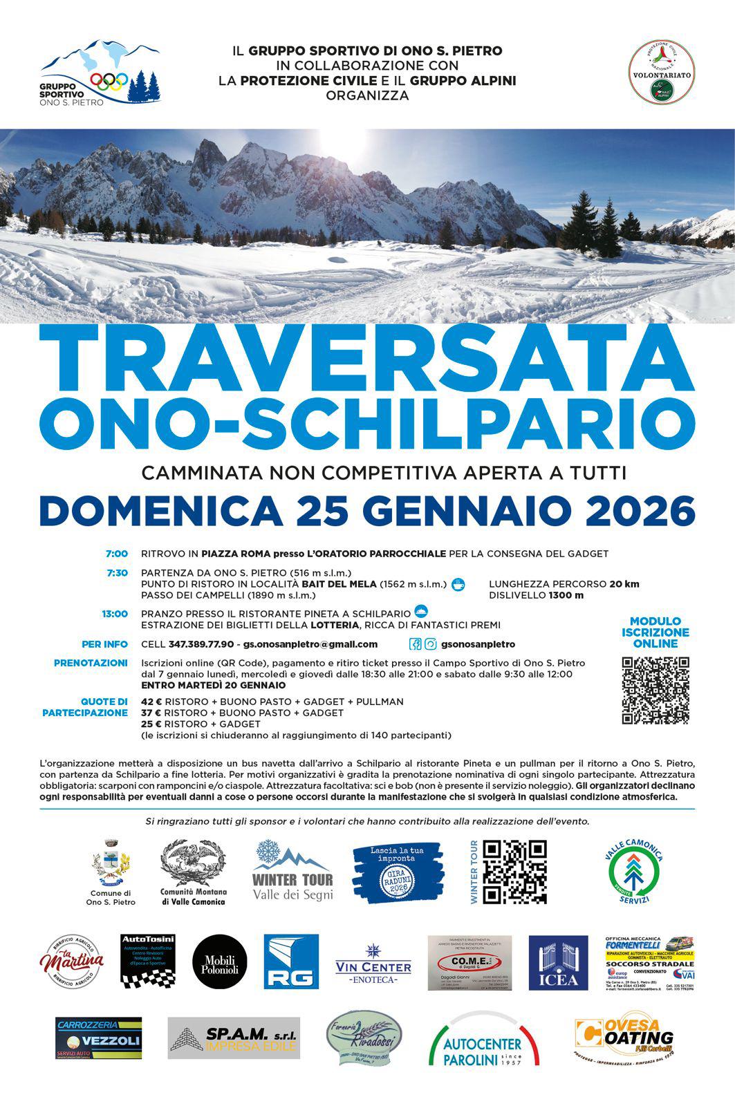 La traversata Ono‑Schilpario è una suggestiva escursione invernale inserita nella “Winter Tour Valle dei Segni”, il circuito di ciaspolate e raduni scialpinistici che anima le montagne della Valle Camonica e delle valli limitrofe da dicembre a marzo.