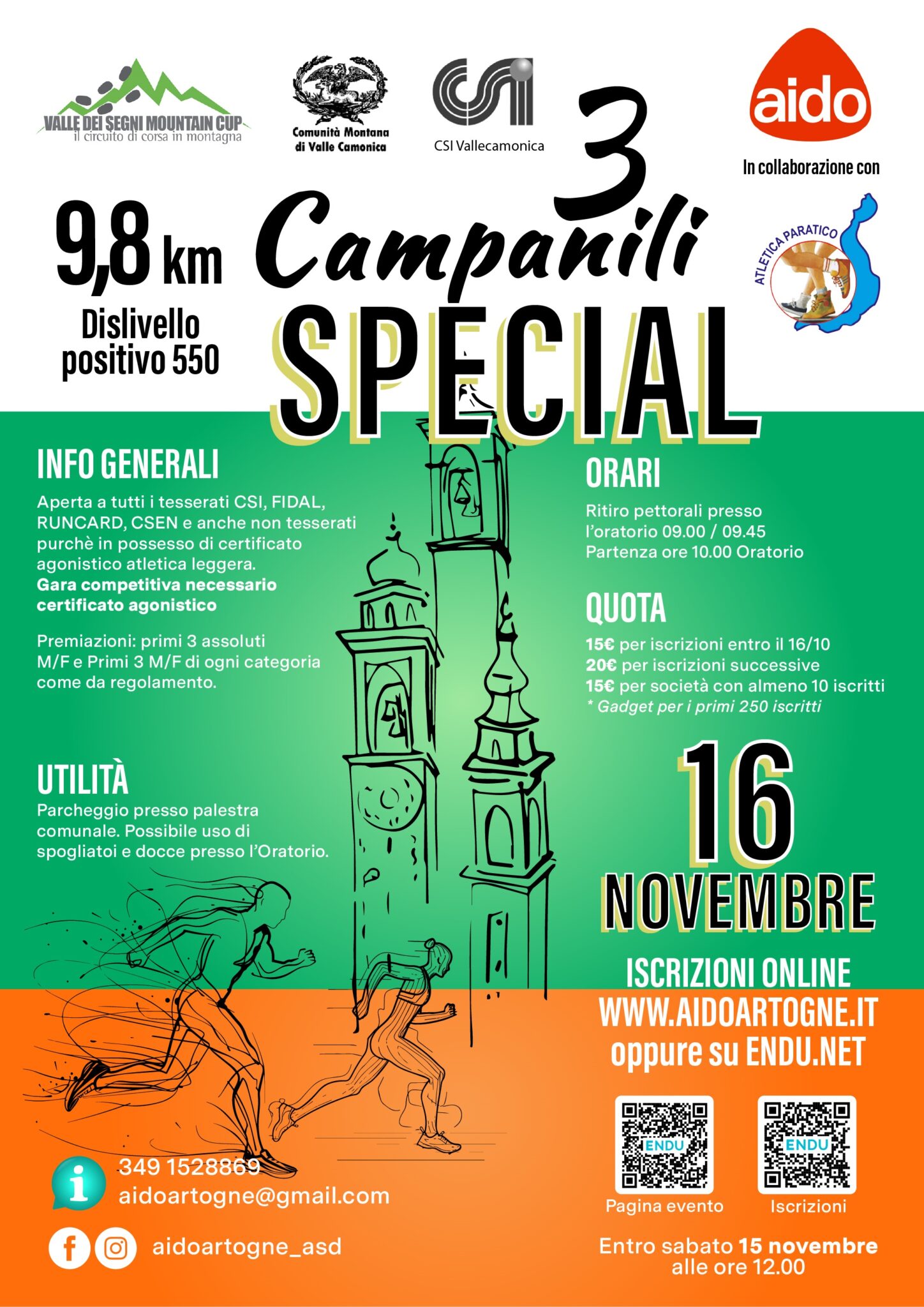 AIDO Artogne asd organizza la 4^ edizione della “Tre Campanili Special, inserita come ultima tappa a punti del circuito della Valle Dei Segni Mountain Cup.